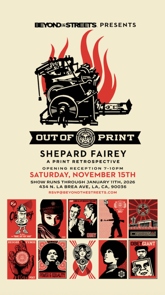 BEYOND THE STREETS is proud to present SHEPARD FAIREY: OUT OF PRINT, a landmark exhibition devoted to the artist’s lifelong dialogue with printmaking. Bringing together more than 400 original screen prints alongside new and re‑mixed works that combine screen printing and stenciling, the exhibition surveys Fairey’s enduring commitment to the image, the multiple, and the power of mass communication.