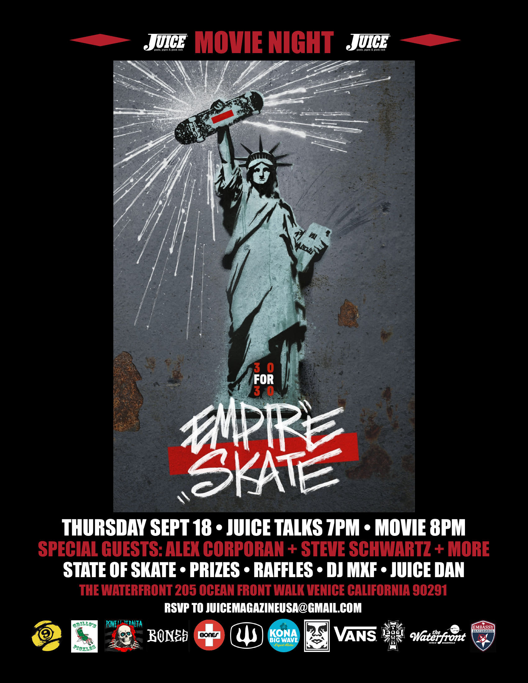 Juice Movie Night Special Guests include “EMPIRE SKATE” Co-Director ALEX CORPORAN, and STEVE SCHWARTZ co-founder of Skate N.Y.C., and RODNEY SMITH, founder of Shut Skates, who will be joining Juice Dan Levy for the Juice Talks Q&A.