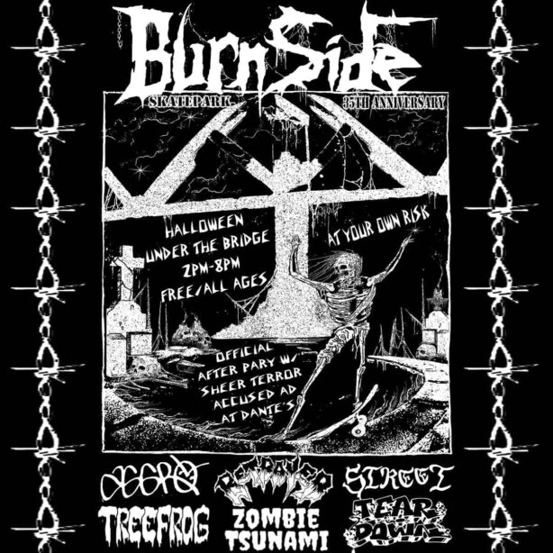Happy 35th Birthday Burnside! Friday, October 31st A.K.A. Halloween Under The Bridge, will be the 35 Year Anniversary Celebration of Burnside Skatepark and the birth of concrete DIY! It’s free for all ages, with live music from 2pm till 8pm featuring Aggro, Treefrog, Betrayer, Zombie Tsunami, Street, and Tear Down.
