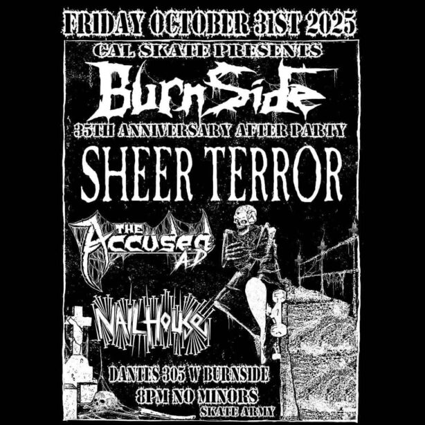 The @Burnside_Skatepark 35th Anniversary Official After Party presented by Cal Skate and the Burnside board of directors is at Dantes Portland @dantesportland located at 305 W Burnside. Doors open at 8 pm and the show starts at 9pm with East Coast hardcore pioneers Sheer Terror @officialsheerterror plus the innovators of splatter rock, The Accused A.D. @theaccusedad & Nailhouse @nailhouse_condemned featuring members of Schroeder Bomb, Religious War, Defiance and Hammered Grunts ! Artwork on display by Jay Meer. Show up to the after party to support Burnside!