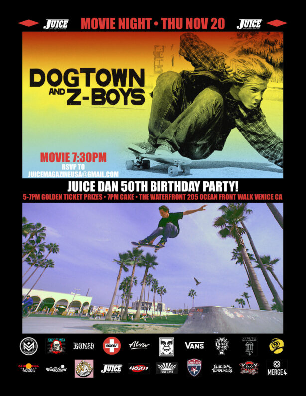 Join us at The Waterfront in Venice Beach, California, on Thursday, November 20th as we show “Dogtown & Z-Boys” and celebrate @JuiceDan 50th Birthday with Doughnuts from Voodoo Doughnuts. Jeff Ho will be the Juice Talks Special Guest and we will have Golden Ticket prizes from Powell Peralta, Vans, Embassy Skateboards, Obey Giant, California Locos, Dogtown Skateboards, Suicidal Tendencies, Sector 9, Alva, Zephyr, Bones Wheels, Bones Bearings, Black Flys, and more.